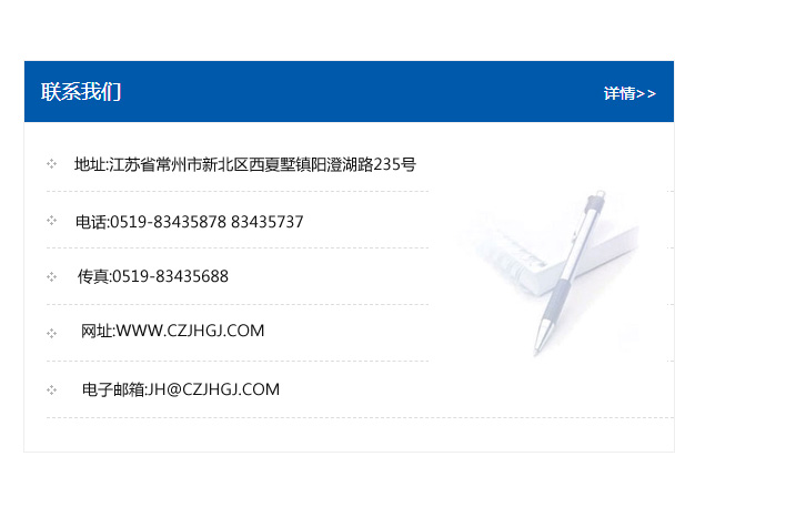 地址:常州市新北區友邦商務大廈1幢16、17層  電話:0519-85101652  傳真:0519-85112595  郵編:213022  網址:www.cz-jiayue_cn.cs5x.com  郵箱:xiajifengaa@163.com